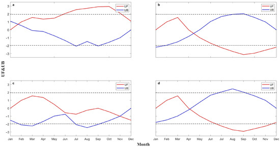 UF and UB line in the Mann–Kendall test result for a monthly number of four types of eddies (a) wce, (b) cce, (c) cae, and (d) wae.