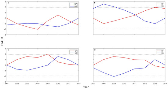 UF and UB line in Mann–Kendall test result for an annual number of four types of eddies (a) wce, (b) cce, (c) cae, and (d) wae.