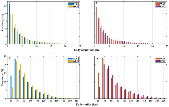 Statistical histogram of the eddy amplitude (units: cm) and eddy radius (units: km) of the four types of eddies in the STCC region. Comparisons between (a) the eddy amplitude of CCEs and WCEs, (b) the eddy amplitude of WAEs and CAEs, (c) the eddy radius of CCEs and WCEs, and (d) the eddy radius of WAEs and CAEs are shown. The yellow, blue, purple, and red bars represent warm cyclonic eddies, cold cyclonic eddies, cold anticyclonic eddies, and warm anticyclonic eddies, respectively.