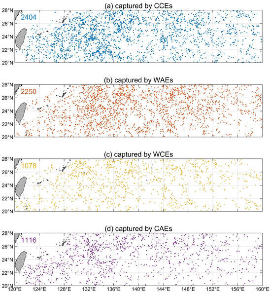Spatial distributions of the Argo profiles captured by (a) CCEs, (b) WAEs, (c) WCEs, and (d) CAEs. The profile numbers are shown at the northeastern corner of each subfigure.
