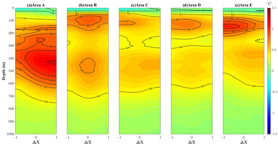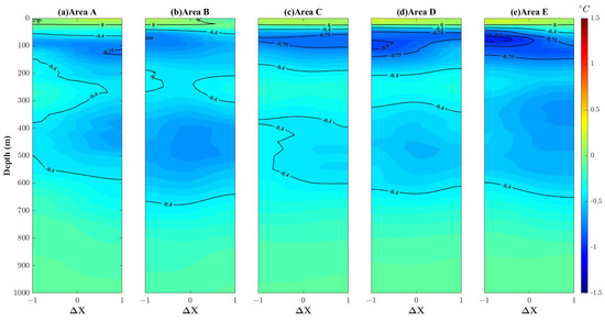 Figure 10 shows the vertical zonal sections ( in the eddy-coordinate system) of the temperature anomalies (°C) of the composite CAE (cold anticyclonic eddy) in Areas A–E. It is worth noting that the composite vertical structures of the cold anticyclonic eddy generally have structures similar to those of conventional anticyclonic eddies (WAEs), which usually have warm subsurfaces and evidently positive temperature anomalies inside the cores [36,37]. Except for the composite CAE in Area A with an eastward core (maximum +1.2 °C) at ∼450 m depth, the vertical structures of composite CAE in Areas B–E all have two cores: the upper core is located at ∼120 m and the lower one is at about 400–450 m. Furthermore, the composite structure of cold anticyclonic eddies (CAEs) in Area B exhibits the highest degree of symmetry. The asymmetric tilt of composite structures in other regions may be attributed to the advection of the background temperature gradient by the eddies or changes in ocean topography within the STCC region. By comparing with previous studies about abnormal eddies [29,31,33], the key difference between the composite structures of cold anticyclonic eddies (CAEs) and warm cyclonic eddies (WCEs) lies in the heat content anomalies (HCAs) in the upper layer, generally considered to be between 0 and 100 m. Composite CAEs tend to exhibit lower HCAs compared to composite warm anticyclonic eddies (WAEs). Our research findings indicate that, above the warm cores of CAEs, negative temperature anomalies can be observed, starting at approximately 30 m below the sea surface, confirming the conclusions drawn by Ni et al. (2021) [28].