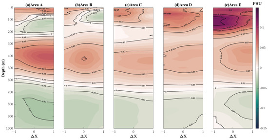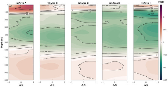 The vertical sections of salinity anomalies for composite cold anticyclonic eddies (CAEs) and warm cyclonic eddies (WCEs) in five zones (A, B, C, D, and E) are shown in Figure 12 and Figure 13. The salinity anomalies for composite CAEs are uniformly positive from depths of 250 m to 600 m but become negative below 600 m. Low salinity cores are observed at depths of 100–200 m in Area A and at 25–125 m eastward in Area B. High salinity cores, with maximum values of around 0.05, 0.08, and 0.12 PSU, are found in the western parts of Areas C, D, and E, respectively.