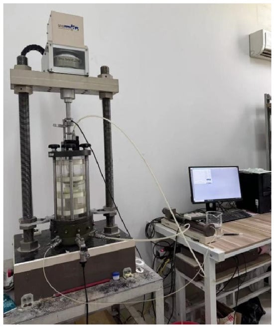 The instrumentation used in this paper is the GDS Dynamic Triaxial Test System (ELDyn) from the UK, as shown in Figure 1, which consists of an axial pressure loading module, a peripheral pressure loading module, a pressure chamber, a counter-pressure controller, a data acquisition module, and the GDSLab operating software (v2.5.0). Under the strain-controlled mechanism, the test system can implement a maximum axial dynamic load of ±5 kN, a maximum frequency of 20 Hz, and a maximum pressure of 1000 kPa. This test system can meet the requirements of different test conditions and test scenarios. Cylindrical soil samples were prepared with a diameter of 50 mm and a height of 100 mm. As the tested soil showed low permeability, the dynamic tests were carried out under undrained conditions. The vacuum saturation method was adopted as the only saturation method in this study, and the saturation of soil samples was up to the test requirement after 24 h vacuum saturation. The samples were submerged in a vacuum saturator after cutting and were placed on the apparatus immediately after the completion of saturation for the experiments.