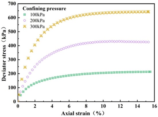 The effective cohesion of the weathered residual granite is 6.57 kPa and the effective internal friction angle is 34.77°. The stress–strain curves of the testing soil samples under different confining pressures are illustrated in Figure 2. The deviational stress of the soil samples accumulates continuously with the increase in axial strain, and the stress–strain curves first increase linearly, then slowly grow non-linearly, and eventually flatten out. When the axial strain is 0–3%, the soil specimen is in the elastic deformation period, and the curve increases linearly. When the axial strain is 3–6%, the sample is in the elastoplastic deformation stage, and the internal structure of the soil sample begins to fail irreversibly, and the curve grows nonlinear. The strain hardening occurs when the axial strain is greater than 6%, and the specimen gradually loses its bearing capacity and finally in the failure state.