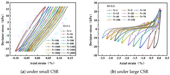 Figure 3 shows the hysteresis curves of weathered residual soil samples at 40 kPa confining pressure. When the cyclic stress ratio (CSR) is relatively small, the shape and position of hysteresis curves of the soil sample basically do not change significantly with the increase in the cycle numbers, and the cumulative strain is small. Under cyclic loads with small CSR, the soil sample is still in a stable state, and the morphology of the soil sample is basically unchanged, which indicates that the internal connections of soil particles do not change greatly. As shown in Figure 3a, the areas of hysteresis curves in each cycle are roughly same, which means the dissipated energy after each cycle is almost the same.