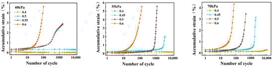 Figure 4 shows the relationship between the accumulative strain and the number of cyclic loads under different dynamic stress amplitudes with three levels of confining pressure. When the CSR is relatively small, the cumulative strain generated by the soil under the action of the cyclic load is small, and the cumulative strain increases slightly with the increase in the number of cycles but is at a low level as a whole. At this time, the appearance of the sample is almost unchanged and can withstand long-term low-strength cyclic loading. When the CSR is relatively large, the cumulative strain of the sample first increases slowly and then increases rapidly after a certain number of cycles. Under the action of high-strength dynamic load, the internal structure of the soil is destroyed, resulting in the axial flattening of the external shape. The larger the CSR, the faster the cumulative strain curve develops, and the more prone to deformation and failure of the sample.