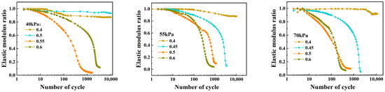 When the CSR is relatively large, the dynamic elastic modulus ratios of the soil sample rapidly decay to near 0 with the increase in the cycle number. More critically, the greater the CSR, the more drastic the modulus decay. Under large cyclic loads, soil samples are unable to withstand high-strength cyclic loads and gradually lose the bearing capacity. The large CSR leads to the obvious attenuation of dynamic elastic modulus under the same confining pressure.