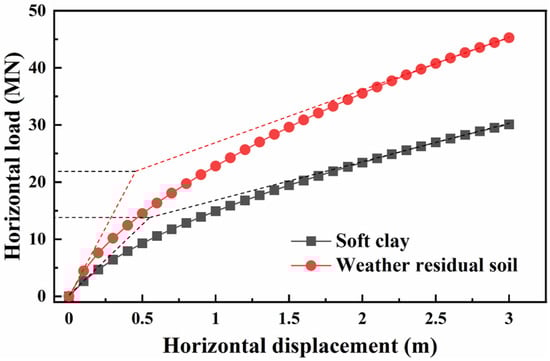 It can be seen from Figure 7 that the horizontal load of the monopile foundation increases with the increase in horizontal displacement whether in weathered residual soil (soil B) and soft clay (soil A) and the load–displacement response curve undergoes the linear to a nonlinear relationship. At the initial loading stage of horizontal load, the pile–soil system is in the elastic deformation stage, and the relationship between horizontal load and displacement is linear. With the increase in horizontal load, plastic deformations occur on the soil around the monopile foundation, and the curvature of the load–displacement response increases slowly. The relationship between horizontal load and displacement becomes nonlinear, and the pile–soil system is in the plastic failure stage.