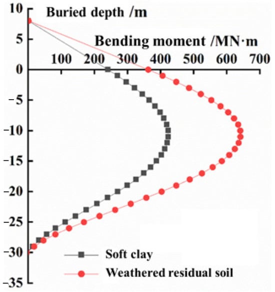 Figure 8 shows the response of the bending moment of the pile body with burial depth at the 3 m horizontal displacement imposed on the pile head. It can be seen that the pile bending moment firstly increases with the burial depth, then gradually decreases after reaching the peak value; meanwhile, the maximum value of bending moment occurs at the 11 m burial depth. It is also noted that the bending moment of the pile body in soil A is obviously greater than that in soil A. The maximum bending moment in soil A is 423 MN·m, and the maximum bending moment in soil B is 641 MN·m, that means that the horizontal resistance of soil B is greater than that in soil A, and greater bending moment is needed to make the pile–soil structure failure in soil B.