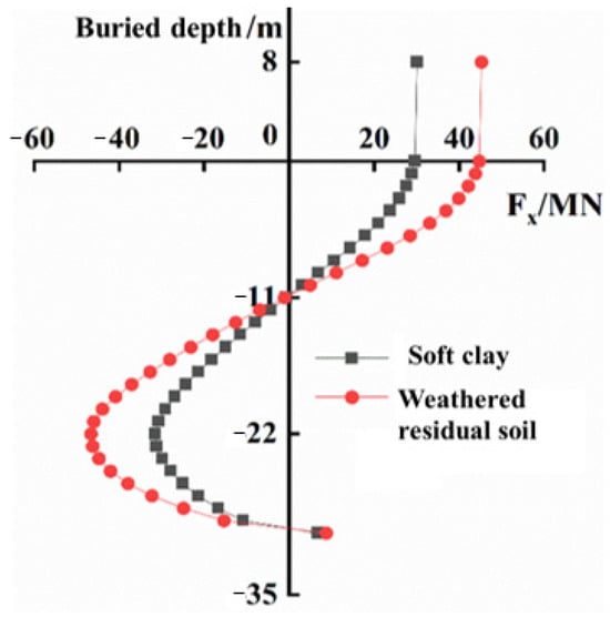 Figure 9 illustrates the response of the shear force with the pile burial depth at the 3 m horizontal displacement imposed on the pile head, and the negative value of shear force in the figure only represents the opposite direction. The changing trend of the shear force of monopile foundation in two soil seabeds is the same. The shear force gradually decreases from 0–11 m burial depth and changes direction at −11 m burial depth, which corresponds to the maximum bending moment of the pile. The absolute value of shear force under 11 m burial depth increases firstly and then decreases, and reaches the maximum value at 22 m burial depth, which corresponds to the rotation point of the pile. Compared with the two working conditions, the shear force value of the pile body in soil B is greater than in soil A, and greater shear force is required to make the deformation failure of the pile–soil structure in soil B.