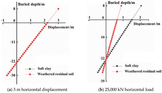The monopile foundations in weathered residual soil and soft clay belong to the rigid pile in the study, and the horizontal displacements of the pile body at different burial depths are illustrated in Figure 10. With an imposed 3 m horizontal displacement on the pile head, the pile displacement–burial depth curves of two soil seabeds are completely consistent, as shown in Figure 10a, and the monopile foundation rotates around a point at about 22 m burial depth, which is defined as the rotation center. The pile body rotates to the right above the rotation center and rotates to the left below the rotation center. Meanwhile, the rotation center is 2/3 of burial depth (L), and this study’s conclusions have been obtained in previous studies.