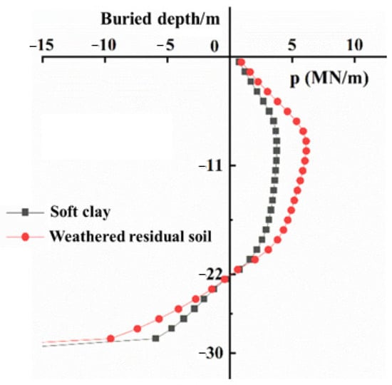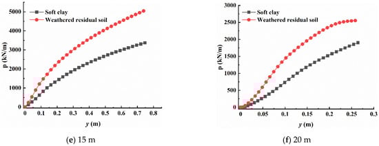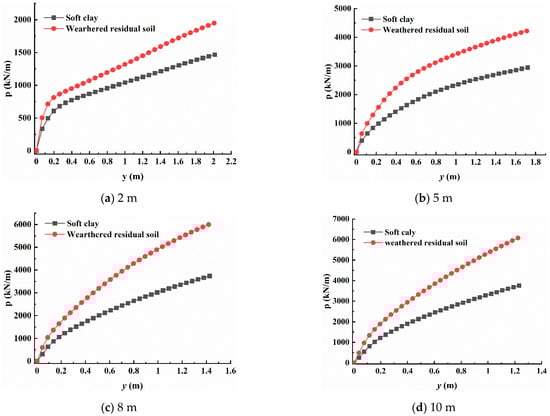 Figure 12 shows p–y curves at different burial depths. The soil resistance increases with the increase in horizontal displacement, and the p–y curves increase linearly and then nonlinear slowly. Under the same load conditions, the p–y curve of soft clay seabed is below that in the weathered residual soil, indicating that weathered residual soil can produce greater resistance to prevent the deformation of the monopile foundation.