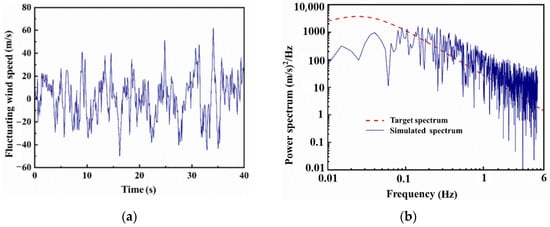 Fluctuating wind speed time history curve and power spectrum. (a) Time history curve of fluctuating wind speed at 10 m height. (b) Power spectrum for simulating wind speed.