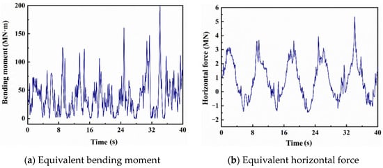 Wind and wave loads actioning on the monopile foundation are calculated according to the above-simplified theories and methods, and the equivalent load of wind and wave loads is applied to the pile head, as Formula (8) shows. The mechanical effects of the equivalent combined load on pile sections are the same as that before the equivalent transformation. The time history curve of the equivalent bending moment and force applied to the pile head are shown in Figure 14.