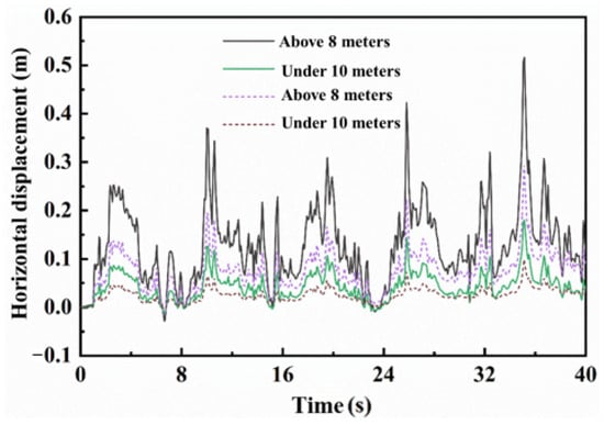 The central point at the pile head (8 m) and the central point of the monopile below 10 m mud surface are selected as the feature points, respectively. The change curves of horizontal displacement at different feature points of monopile foundation in two soil seabeds are shown in Figure 15. It is noted that the displacement time–history response curve fluctuates in an 8 s period, due to wave load with 8 s period actioned on monopile foundation. In general, the displacement time–history response curve of feature points at 8 m is above that of −10 m, indicating that the horizontal displacement of the pile head is greater. It can also be seen that the displacement time–history response curve of feature points of monopile foundation in soil A is above that in soil B, which indicates that the horizontal displacement of monopile foundation in weathered residual soil seabed is small and has a large bearing capacity.