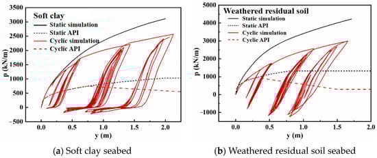 Comparing the static p–y curve calculated by numerical simulation with the static p–y curve calculated by API specification, it is found that the p–y curve calculated by API specification is below that from numerical analysis. The ratio of static soil resistance obtained by API and numerical simulation rapidly decreases when the horizontal displacement y is small (0–0.5 m). When the horizontal displacement y is greater than 0.5 m, the soil resistance ratios decrease trend slows down, which indicates that the API specification underestimates the soil resistance to a certain extent, especially in the case of large horizontal displacement. In addition, the static soil resistance ratio of API and numerical simulation in soft clay is overall greater than that in weathered residual soil, and it is obvious that the API specification is more unsuitable for weathered residual soil.