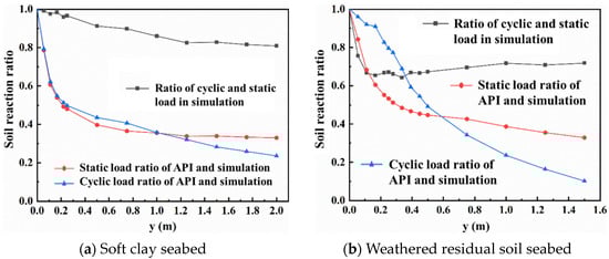 The cyclic p–y curve method recommended by API specification also significantly underestimates the soil resistance, and the underestimation degree becomes more obvious with the increase in horizontal displacement. In soft clay seabed, the changing trend of the soil resistance ratios of API cyclic p–y curves and cyclic numerical simulation is the same as that under static working conditions, the cyclic soil resistance ratios decrease rapidly from 1 to 0.4 at the initial small displacement stage, and then decrease slowly trends toward 0.2. However, the changing trend of the soil resistance ratios in weathered residual soil is different. The ratio decreases slightly with the increase in horizontal displacement, and the cyclic soil resistance ratio is also higher than the static ratio in the small displacement stage, while the cyclic soil resistance ratio is lower than the static ratio in the large displacement stage and continues to decline to 0. This is because the cyclic loads have a greater influence on the weathered residual soil.
