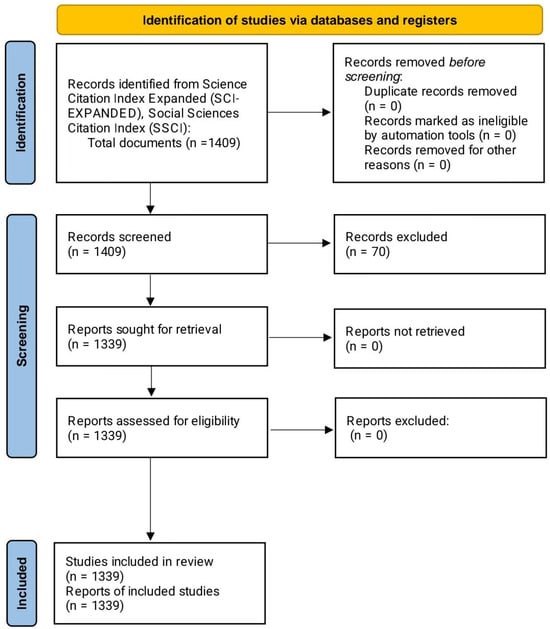 The search strategy employed a combination of main and secondary keywords to identify the relevant literature in the WoS database. The last search date for this study was 8 August 2024, ensuring that our retrieval covered the most recent research literature. Table 1 provides a detailed overview of the search strategy.