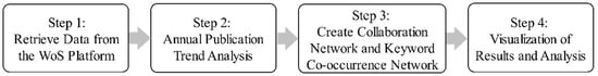 Figure 2 illustrates the bibliometric analysis process utilized in this paper. The analytical process of this study consists of several key stages. First, based on predefined keywords and database screening, the relevant literature on green shipping is collected and publication trends are analyzed. Next, bibliometric analysis is conducted, focusing on co-occurrence analysis to identify collaboration networks among authors, institutions, and countries. Finally, a keyword co-occurrence analysis is performed to examine current research hotspots and identify potential future research directions. This process is designed to systematically assess the development and trends within the field of green shipping research.