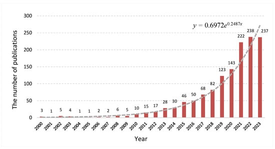 Figure 3 illustrates the annual publication trends in green shipping research from 2000 to 2023. As shown, the field has experienced significant growth, particularly in recent years, when research activities have surged. This trend reflects the growing investment and focus on green shipping within the global academic community. The importance and impact of related research have been widely recognized and have grown rapidly.