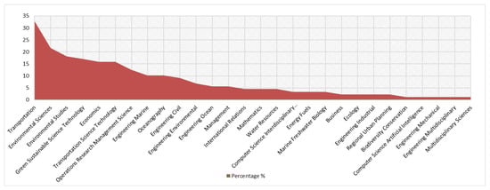Furthermore, we analyzed the Web of Science categories for the fields of study of the top authors, as shown in Figure 4. These leading authors are primarily concentrated in areas such as “Transportation”, “Environmental Sciences”, “Environmental Studies”, and “Green Sustainable Science Technology”. These fields represent the majority of green shipping research, highlighting the broad range of interests and concerns related to environmental sustainability and the optimization of transport systems.