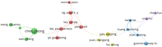 In the VOSviewer software, we set the minimum number of documents per author to 5 and the minimum number of citations to 0. Researchers who did not collaborate with others in the network were excluded. Using these parameters, we generated the researcher collaboration network diagram (Figure 5), which illustrates the collaborative relationships and research directions of major research teams in the field of green shipping.