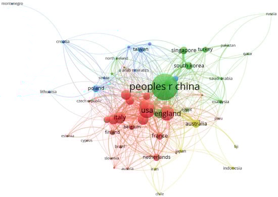 The cooperation network map (Figure 6), generated using VOSviewer software, shows that China, the United States, and England not only have a high volume of publications but also demonstrate strong collaborative ties in international research. Notably, China has 226 cooperative links with other countries, the highest among these nations, reflecting its pivotal position in global green shipping research. These data reveal the dynamic nature of international collaboration within the green shipping field and highlight the central role of key countries in driving global research efforts.