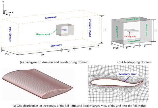 As seen in Figure 3, the cuboid-like domain consists of a computational domain that can be divided into two parts, the overlapping grid domain and the background grid domain. As for the overlapping domain (seen in Figure 3b), the size is designated as (x, y, z) = (3C, 3C, B + 2C). Considering that the AR effect will be analyzed, the value of span length (B) is set as a variable, and so is the length of the overlapping domain along the z-axis direction. The foil is located at the center of the overlapping domain. When it comes to background domain, the relevant size is chosen as (x, y, z) = (38C, 12C, B + 6C), and the overlapping domain is also located in the center.