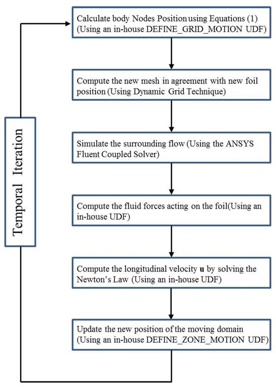 The solving procedure is shown in Figure 4. The UDF of DEFINE_GRID_MOTION defines the foil’s flexible motion, and the dynamic grid technique is applied to realize the corresponding deformation. When the position of the foil is acquired, the corresponding fluid force will be calculated with the help of ANSYS Fluent. Next, the corresponding acceleration will be calculated according to Formula (4), where F is the force acting on the foil, m denotes the mass of the foil, and V denotes the moving velocity.