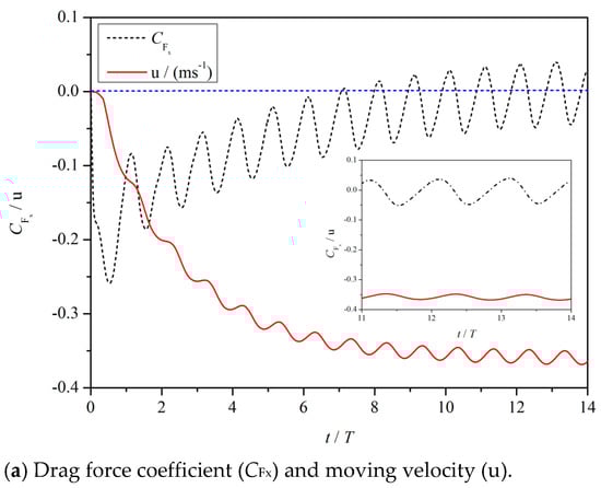 As for CFx and η, seen in Figure 6a, the flexible foil starts to move at the initial time (t = 0), and the corresponding magnitudes of CFx and η start to increase considerably. It is noted that the values of CFx and η are negative, meaning that the flexible foil starts to move along the negative x-axis. With the further increase in motion time, the variation curves of CFx present a trend of periodic fluctuation, and the variation amplitude starts decreasing. The value of u keeps increasing with a comparatively small acceleration. When t/T = 8, the positive value emerges in the variation curves of CFx, that is, the drag force starts to act on the foil. The existence of drag force keeps cutting down the acceleration of the foil, and the growth speed of u also presents a consistent decline. When t/T = 11, the evolution curves of CFx are nearly symmetric along the x-axis, and the corresponding mean value moves around zero. This means that the flexible foil acquires the condition of balance and the corresponding moving velocity also achieves dynamic balance, i.e., although the moving velocity undergoes periodic change, its mean value remains unchanged.