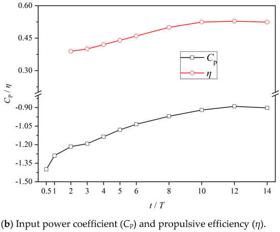 As for Cp and η, it can be deduced from Figure 6b that the value of Cp is tremendous, implying that much energy will be consumed to activate the forward motion of the foil. With the consistent increase in motion time, the value of CFx keeps decreasing, and so does the corresponding value of η. When t/T = 8, the decreasing magnitude of Cp turns into a small value and Cp gradually becomes stable. When t/T = 11, the fluctuation in the value of Cp is pretty small, meaning that Cp changes into a condition of balance. As for the value of η, the changing tendency is opposite to that of Cp. Specifically, the value of η exhibits a trend of gradual decrease, while the foil keeps moving forward and achieves a condition of dynamic balance at t/T =11.0. This conclusion is consistent with the phenomenon of increase in the moving velocity (Figure 6a) and decrease in Cp (Figure 6b).
