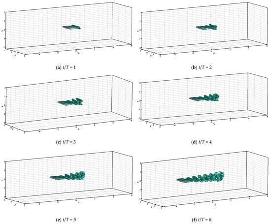 As seen in Figure 7, at t/T = 1, the flexible foil starts to move forward, and the attached vortex structures show up on its surface. The attached vortex structures move backward along the foil surface and finally fall off from it. Specifically, the attached vortex on the foil upper surface moves toward the downside of the center-line, while the vortex on the lower surface moves in the opposite direction. With the consistent progression of motion time (t/T = 2), the shedding vortex in the flow field starts to be stretched and connected with the tip vortex structures, forming a complete vortex ring. With the consistent motion of the foil (t/T = 3), three vortex rings show up in the flow field, and the adjacent two vortex rings present a staggered arrangement. When the foil moves at x = −2.8 (t/T = 6), a series of vortex rings emerge in the wake of the foil. To illustrate the vortex structures more clearly, Figure 8 presents three views of the vortex structures at time t/T = 6.