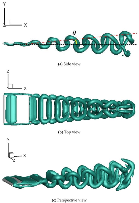 Similarly, three views of vortex structures under three typical values of d are presented in Figure 12 to give some explanation for the above results.