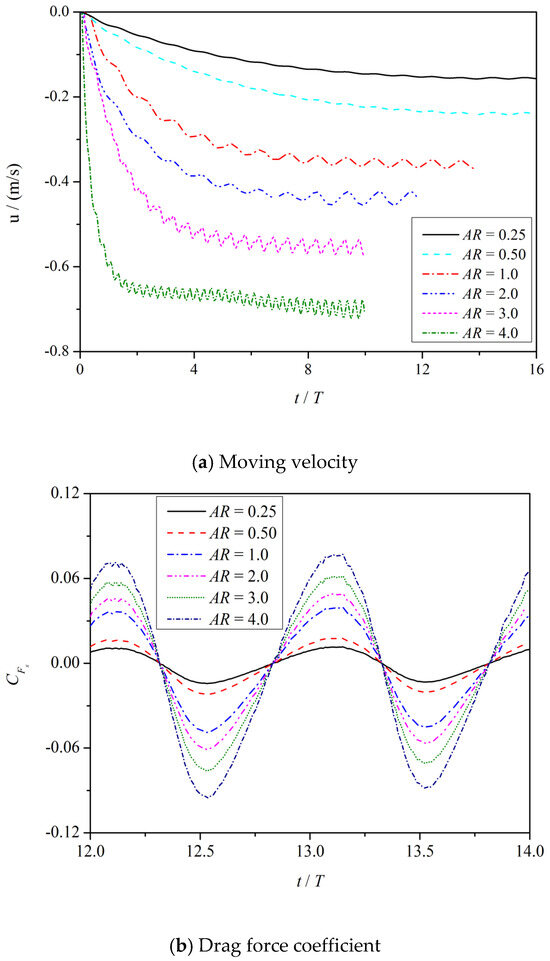 It can be acquired from Figure 9a that the changing curves of |uMean| under various values of AR can finally achieve a state of dynamic balance, that is, although the value of moving velocity undergoes consistent change with the variation of motion time, the fluctuating amplitude and period remain unchanged. The difference lies in that the time required for a foil to achieve dynamic balance keeps decreasing with the further increase in AR, while the corresponding fluctuating amplitude keeps expanding. Specifically, when AR is pretty small (AR = 0.25 and 0.5), it will cost at least 16 motion periods to achieve dynamic balance, and the relevant fluctuating amplitude is comparatively small. With the further increase in AR (AR = 1), at least 14 motion periods are consumed. When AR turns into AR = 3 and 4, 10 motion periods are sufficient for the foil to acquire a stable condition.
