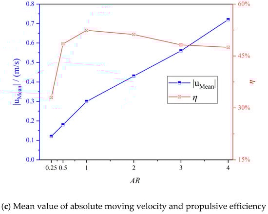 The AR value, ranging from 0.25 to 4.0, is selected to analyze the AR effect on propulsive property. The changing curves of fluid dynamics of the flexible foil under various values of AR are shown in Figure 9. To conveniently characterize the propulsive performance of the foil, the absolute value of moving velocity is utilized, and |uMean| denotes the absolute mean value of u.