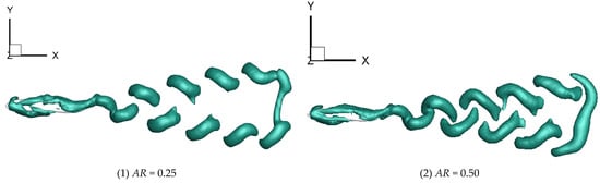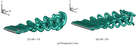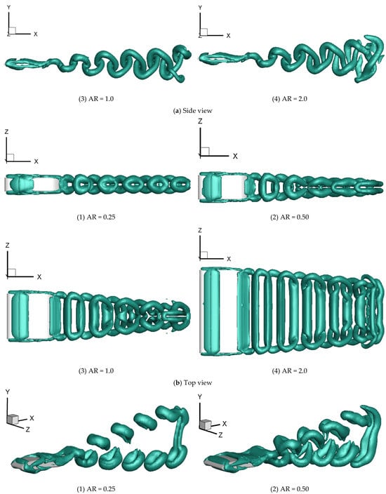 In order to give some explanation for the above numerical results, three views of vortex structures under four typical values of AR are shown in Figure 10.