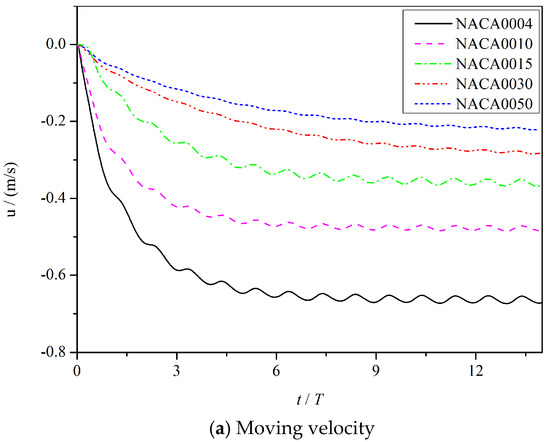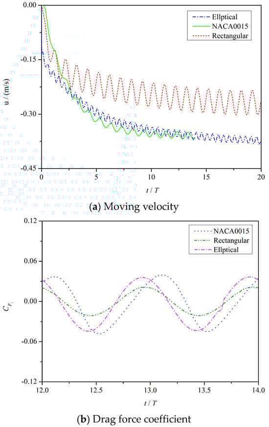 In this part, the effect of section shape will be analyzed. Three typical kinds of section shapes are selected, namely, NACA0015 shape, elliptical shape, and rectangular shape. The geometric parameters of the above three foils are set as B = C =1.0, d = 0.15 C. The corresponding motion parameters are set to be the same as in Section 4.2 and Section 4.3. The variation curves of fluid dynamics of the flexible foil under various kinds of section shapes are shown in Figure 13, with Figure 13a depicting the variation curves of moving velocity and Figure 13b illustrating the variation curves of drag force coefficient. The mean values of moving velocity, input power coefficient, and propulsive efficiency are listed in Table 3.