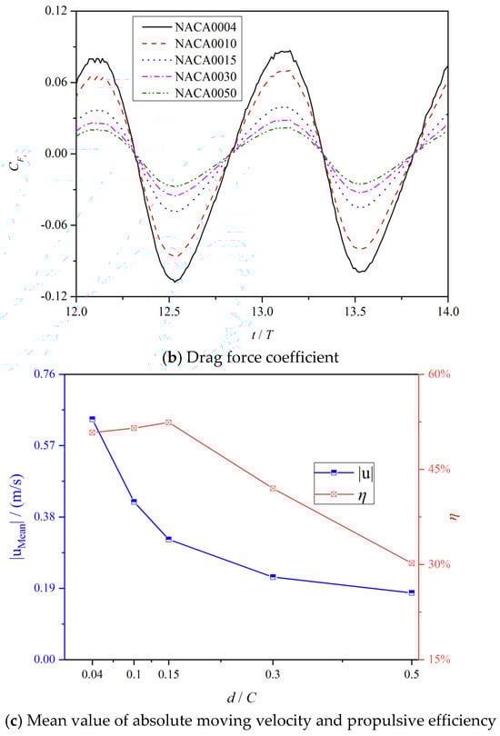 As for u, seen in Figure 11a, the changing curves under various magnitudes of d tend to be stable, and the time required is almost identical, that is, 14 motion periods will be consumed for the foil to realize stable cruising speed. On the other hand, when the foil becomes thick (corresponding to a large value of d), the changing curve of u starts to move upward and the corresponding absolute value of u starts decreasing (seen in Figure 11c), indicating that the increase in d is unfavorable for the moving velocity of the foil. Concerning CFx, Figure 11b reveals that the increase in d leads to the decrease in CFx. Hence, the corresponding magnitude of u declines. As for the magnitude of η, it can be concluded from Figure 11c that when the value of d lies in a small range (d/C ≤ 0.15), the increase in d enhances the magnitude of η. However, when d/C > 0.15, the relevant magnitude of η drops sharply, and the thicker the foil is, the more quickly this occurs. That is to say, the peak magnitude of η can be obtained at d/C = 0.15.