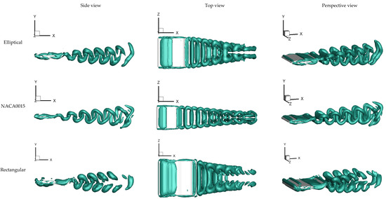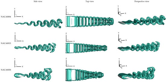 Considering that there is a close connection between flow field and hydrodynamic performance, it is necessary to analyze these structures. The relevant vortex structures are presented in Figure 7, where the corresponding vortex criterion is λ2 [28]. The mathematical definition of vortex can be represented as velocity curl, i.e., (where v denotes the velocity vector of the flow field).