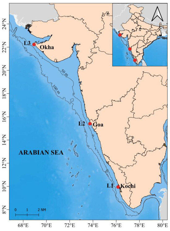 Sampling was carried out during a multidisciplinary oceanographic expedition onboard FORV Sagar Sampada and Sagar Kanya along the WCI (2018–19). The research area spanned from 9.951° N to 22.22° N latitude and 68.940° E to 76.166° E longitude, covering the south—Kochi (L1), central—Goa (L2), and north—Okha (L3) in the eastern Arabian Sea (Figure 1). Each location consisted of 3 samples collected from coastal surface waters as part of MEDAS project of Ministry of Earth Science (MoES) during the summer monsoon—MN (August; FORV SK351), pre-monsoon—PR (April–May; FORV SS375), and post-monsoon—PM (January; FORV SS382). Samples were collected following strict sterility protocols, using Niskin samplers (10 L, Hydrobios, Kiel) (Seabird Scientific, Bellevue, WA, USA) attached to a Conductivity Temperature Depth (CTD) profiler (SBE 19, Seabird Scientific, Bellevue, WA, USA).