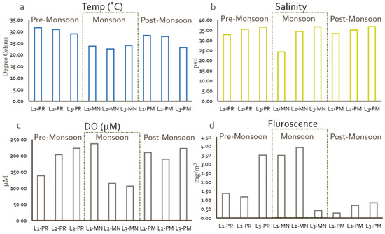 The temperature was considerably higher during PR (30.51 ± 1.34 °C) which was dropped during MN due to monsoonal showers and upwelling. This decline in temperature during MN could be attributed to the presence of upwelled waters, riverine influxes, and precipitation [39,40,41,42,43,44]. A drop in salinity was observed in L1 during MN compared to other stations and seasons. This could possibly be due to riverine fresh water influx, comparatively less saline water inputs, and the low salinity waters transported from the Bay of Bengal [45]. The MN is also characterized by deoxygenation nutrient surge, specifically nitrate, phytoplankton abundance, and chlorophyll a hike [4,46]. Similar to PR, PM is also characterized by a warm temperature and high salinity and a lower chlorophyll a concentration. The nutrients are also very low.
