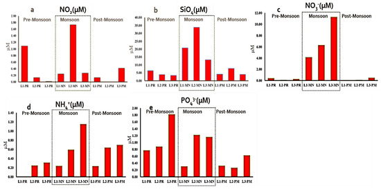 Figure 3. The distribution of (a) nitrite (NO2), (b) silicate (SiO4), (c) nitrate (NO3), (d) ammonium (NH4+), and (e) phosphate (PO43−) during the study period. The x-axis represents the stations and the y-axis represents these chemicals expressed in µM.