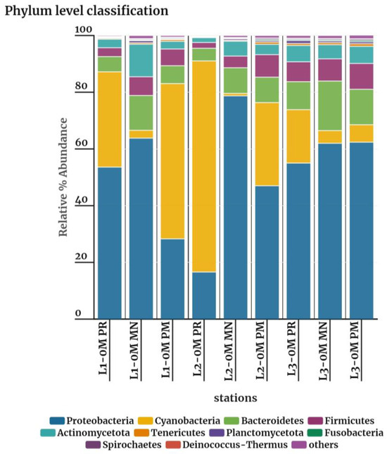 The phylum level analysis indicated Proteobacteria as a dominant phylum in L1 (53.59%) and L3 (55.00%) during PR; conversely, in L2, Cyanobacteria (74.44%) dominated. However, during MN, Proteobacteria emerged as the dominant phyla in L2 (78.73%) and Cyanobacteria declined to 0.86% in L2 and to 2.77% and 4.49% in L1 and L3, respectively (Figure 4). There was an increase in Firmicutes (2.57 to 5.35%) and Actinomycetota (2.36 to 8.36%) during MN in L1 and L2. The abundance of Firmicutes further increased during PM in L1 and L2 (6.91%), whereas Actinomycetota dropped to 3.18%. L3 showed no significant differences in the relative abundance of Firmicutes and Actinomycetota among seasons. There was variation in the relative abundance of Bacteroidetes during PR (6.56%) to MN (12.94%), but this dropped during PM (9.26%) (Figure 4; Table S2).