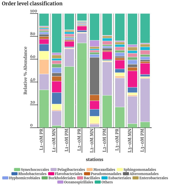 Figure 5. Order-level classification of bacterial communities during pre-monsoon (PR), monsoon (MN), and post-monsoon (PM). The x-axis represents stations, and the y-axis represents relative percentage abundance.