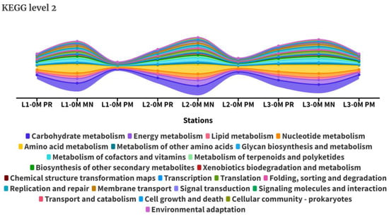 The assessment of functional potential was conducted via KEGG databases using MEGAN. The KEGG analysis unveiled notable disparities among the seasons. KEGG level 1 revealed higher reads on metabolism in MN samples followed by PR (Figure S7). KEGG level 2 analysis supported these results, where the MN samples were functionally more active especially in terms of carbohydrate metabolism, amino acid metabolism, energy metabolism, nucleotide metabolism, metabolism of co-factors and vitamins, lipid metabolism, xenobiotic degradation and metabolism, translation, replication, and repair and membrane transport (Figure 6). The further functional profile was lower in PR and its lowest in PM. Though the seasonal variation was significant, no significant difference between stations was observed functionally during PR and MN. During PM, L3 (north) was functionally more active (in terms of metabolism—carbohydrate, energy, nucleotide, and translation) (Figure 6). Tukey–Kramer post hoc plots ANOVA with Benjamini–Hochberg FDR correction using p-value cutoff < 0.05 and 0.95 confidence identified the significant variation between the KEGG functional profile of MN, PR, and PM (Figures S8 and S9).