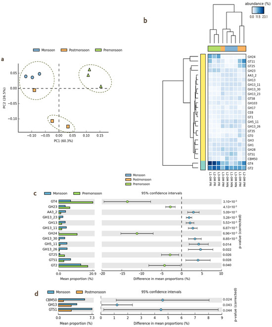 Figure 7. Distribution of Carbohydrate-Active enZymes (CAZymes) during pre-monsoon (PR), monsoon (MN), and post-monsoon (PM). (a) Principal component analysis (PCA) plot and (b) heatmap showing the distribution of various CAZyme families across the three seasons in the study location. The Tukey–Kramer post hoc plots of significant variation of CAZyme distribution between (c) pre-monsoon to monsoon and (d) monsoon to post-monsoon (p < 0.05).