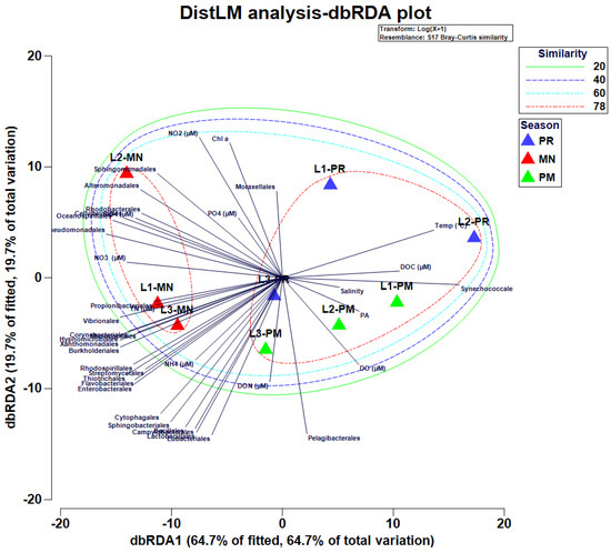 DistLM-based db-RDA analysis revealed distinct physiochemical and biological disparities in the MN compared to the PR and PM. Cluster analysis based on Bray–Curtis similarity indicated that bacterial communities in PR and PM shared 78% similarity, forming a distinct cluster, whereas the MN community formed a separate cluster with 60% similarity to the others. The cluster analysis derived distinctly delineated variations in prokaryotic diversity (Figure 8). The bacterial community composition analyzed using the DistLM indicated that the influencing factors of the bacterial community were predominantly nutrients, whereas for PR and PM it was temperature, salinity, and DO. Additionally, a higher bacterial diversity was observed in MN compared to PR and PM (Figure 8).