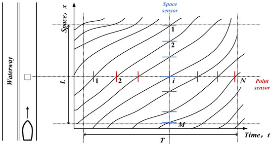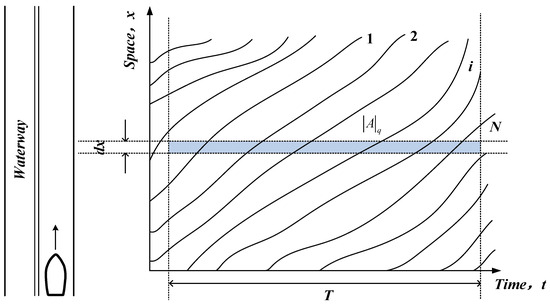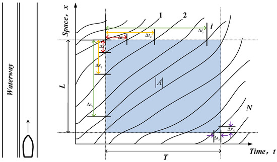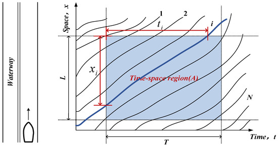 As shown in Figure 1, a time–space region is delineated in a time–space diagram, which is long by the length of channel and wide by time . There are vessels’ trajectories in the region. The trajectory of each vessel is represented as a time–space vector . indicates the distance traveled longitudinally by the i-th vessel in the time–space region, and indicates the time spent. The fundamental characteristics of waterway traffic stream can be derived by averaging the spatial and temporal vectors for estimation, calculated as follows: