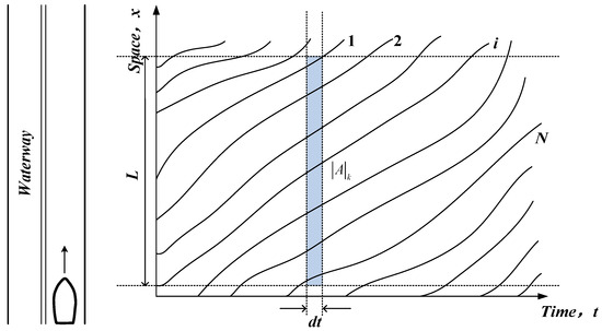 When studying the waterway traffic stream, we usually focus on three fundamental characteristics: flow; density; and speed, as well as their spatial and temporal variability. The definition of fundamental characteristics in the waterway traffic stream usually draws on two approaches used for the road traffic stream. The first method is derived from the Highway Capacity Manual [22], which we call the capacity manual method in this paper. The second method was proposed by Edie [1] in 1963 and is called the time–space region method.