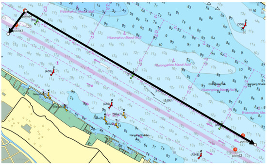Since it is not possible to obtain distances traveled by vessels directly from the AIS data, it is necessary to establish a right-angle coordinate system on the selected channel as a basis for the conversion of latitude and longitude coordinates. As shown in Figure 7, a right-angle coordinate system is established with point 1 as an origin, setting the axes in the same positive direction as the course of the channel.